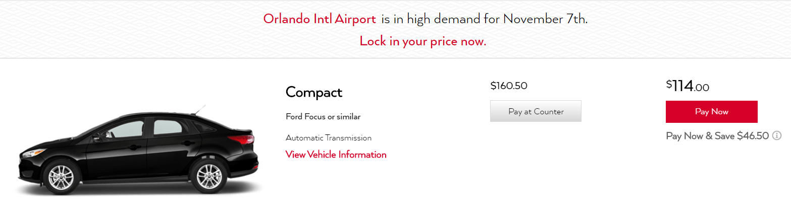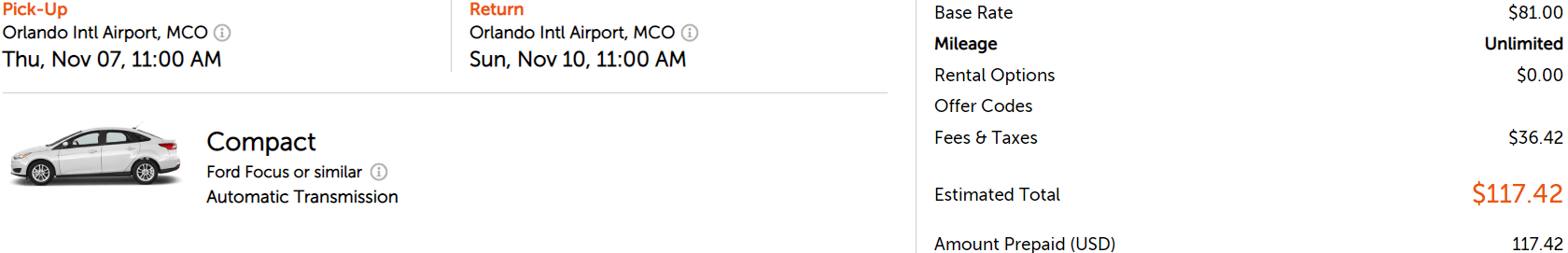- I searched for the car rental from Orlando Airport. Remember to compare prices to close-by locations to avoid the airport fees. (I kept everything at the same place to make the example easier to do).